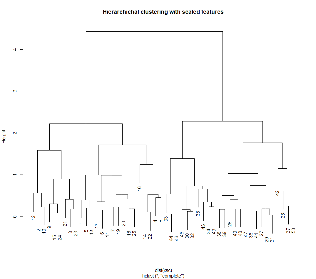 main = "Hierarchichal clustering with scaled features")