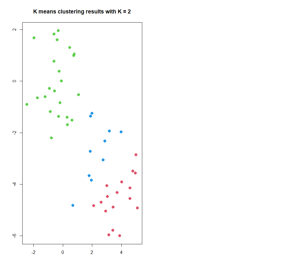 main = "K means clustering results with K = 2",